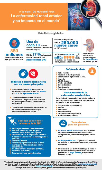 “Se ha dado un aumento en la cantidad de casos de insuficiencia renal crónica, en el mundo. Es por eso que el cuidado de los riñones debe ser fundamental en toda persona, ya que estos eliminan las sustancias de desecho o toxinas producidas por nuestro cuerpo, como sales y agua, en sus funciones normales. Asimismo, son el reservorio de glucosa de nuestro metabolismo y liberan tres hormonas importantes: la eritropoyetina, que estimula la producción de glóbulos rojos; la renina, que regula la presión arterial, y la forma activa de la vitamina D, que permite mantener el calcio dentro de los huesos”, indicó la doctora Rosario Espinoza, gerente médico de Roche Centroamérica y Caribe (CAC).