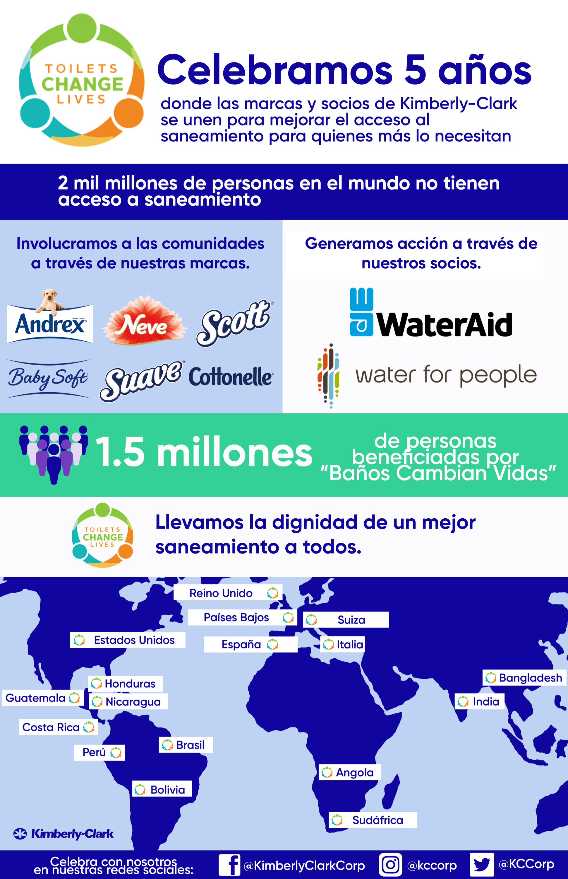 Kimberly-Clark es miembro fundador de Toilet Board Coalition, un grupo de compañías líderes, agencias gubernamentales, especialistas en saneamiento y organizaciones sin fines de lucro, cuyo objetivo es transformar los sistemas de saneamiento y de acceso público. Esta coalición, es una oportunidad para el desarrollo de soluciones sostenibles y escalables para minimizar la crisis de saneamiento.