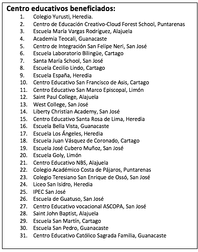 Este beneficio se brindará como una recompensa por su activa participación en el proyecto liderado por ecolones para la recolección de botellas plásticas con el que Costa Rica logró, en diciembre del 2018, el Guinness World Records por la “Mayor cantidad de botellas plásticas recolectadas en ocho horas para reciclar”. Se estima que el aporte brindado a las escuelas impactará más de 13.000 personas entre estudiantes y personal docente y administrativo de los centros educativos beneficiarios, sin contar sus familias y comunidades vecinas.