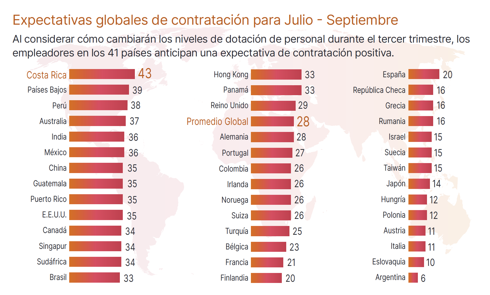 Las intenciones de contratación en empresas costarricenses se mantienen estables. Comparado con el año pasado, las expectativas de empleo han aumentado en un 18%. Costa Rica se encuentra en el primer lugar del ranking top global para sus prospectos de contratación, manteniéndose 15 puntos arriba del promedio global.