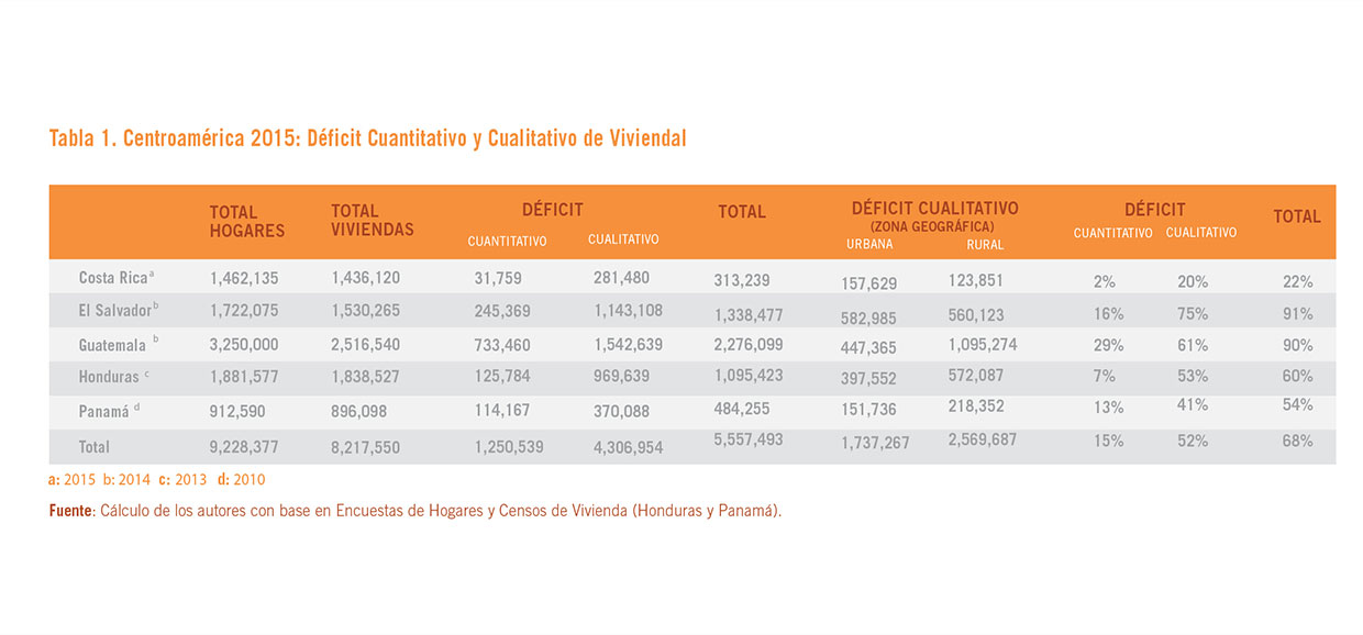 En Centroamérica, se estima que aproximadamente 1,25 millones de viviendas nuevas deben ser construidas. Esta cifra indica que un 13,5% de los hogares centroamericanos no residen en una vivienda de forma independiente. Además del faltante de viviendas, 4,3 millones de las existentes necesitan rehabilitar alguna o varias de sus características.
