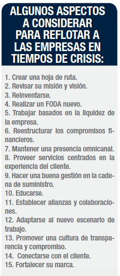Crisis = oportunidad. Cuando nos enfrentamos a una crisis o un obstáculo, existen dos caminos a escoger. Identificar las oportunidades que nos permitan competir y salir adelante o quedarnos en la zona de confort y correr el riesgo de cerrar el negocio. En la manera que aceptemos y nos adaptemos al cambio, así mismo, se podrá redirigir la estrategia a seguir en nuestro nuevo camino.