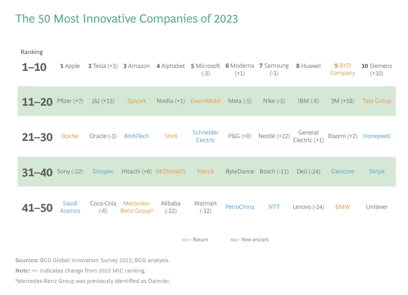 A pesar de los retos que experimentaron las compañías tecnológicas en 2022, estas continúan dominando el top 50, cinco de ellas ocupan los diez primeros puestos. Por tercer año consecutivo, Apple ocupa el primer lugar en la lista. Por su parte, Tesla sube tres posiciones llegando hasta el segundo lugar, y Amazon se mantiene en el tercero. Nueve nuevas empresas se unen al top 50.