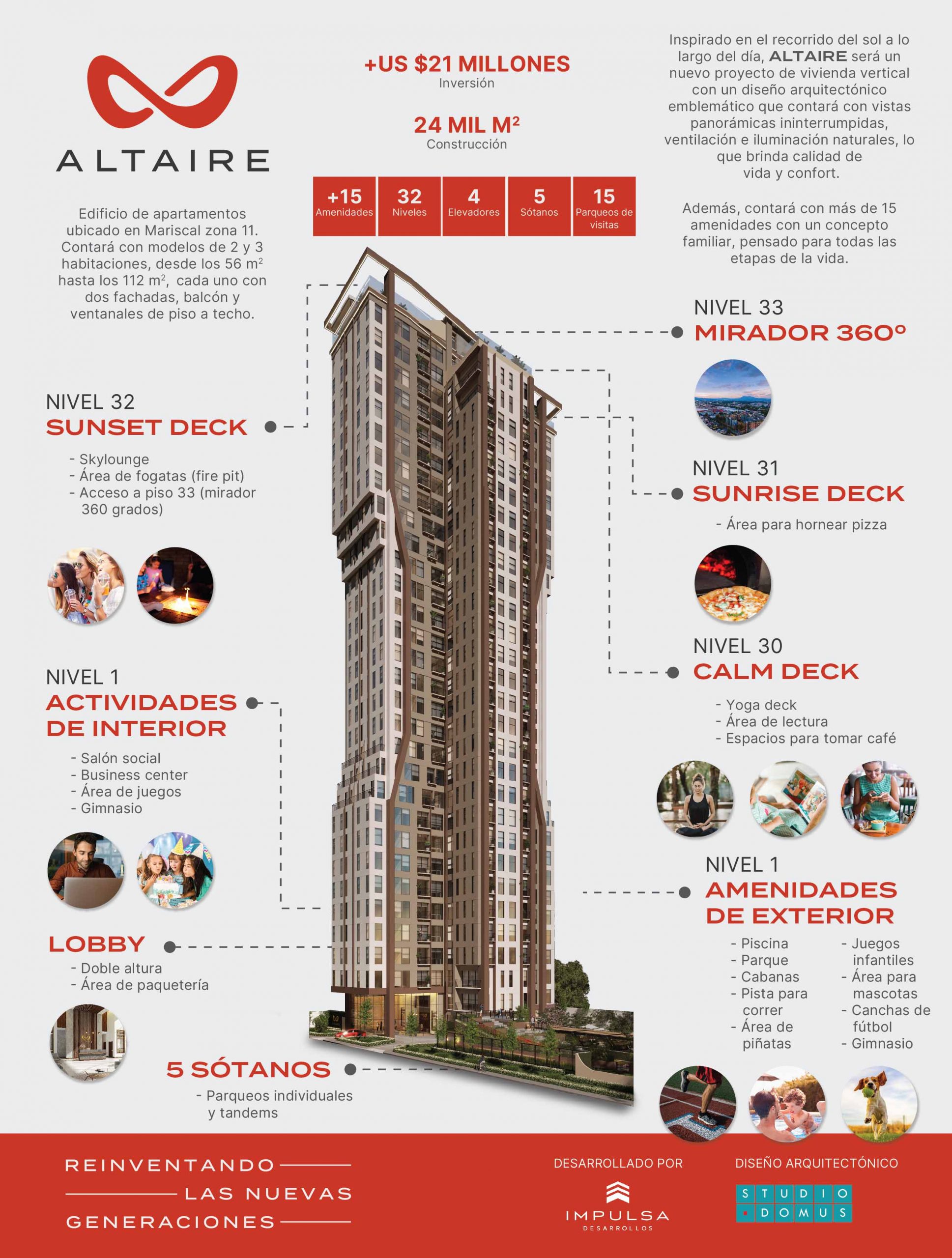 Ubicado en Mariscal zona 11 e inspirado en el recorrido del sol a lo largo del día, Altaire será un nuevo proyecto de vivienda vertical con un diseño arquitectónico emblemático que contará con vistas panorámicas ininterrumpidas, ventilación e iluminación natural, lo que brinda calidad de vida y confort.  Además, contará con más de 15 amenidades con un concepto familiar, pensadas para todas las etapas de la vida.