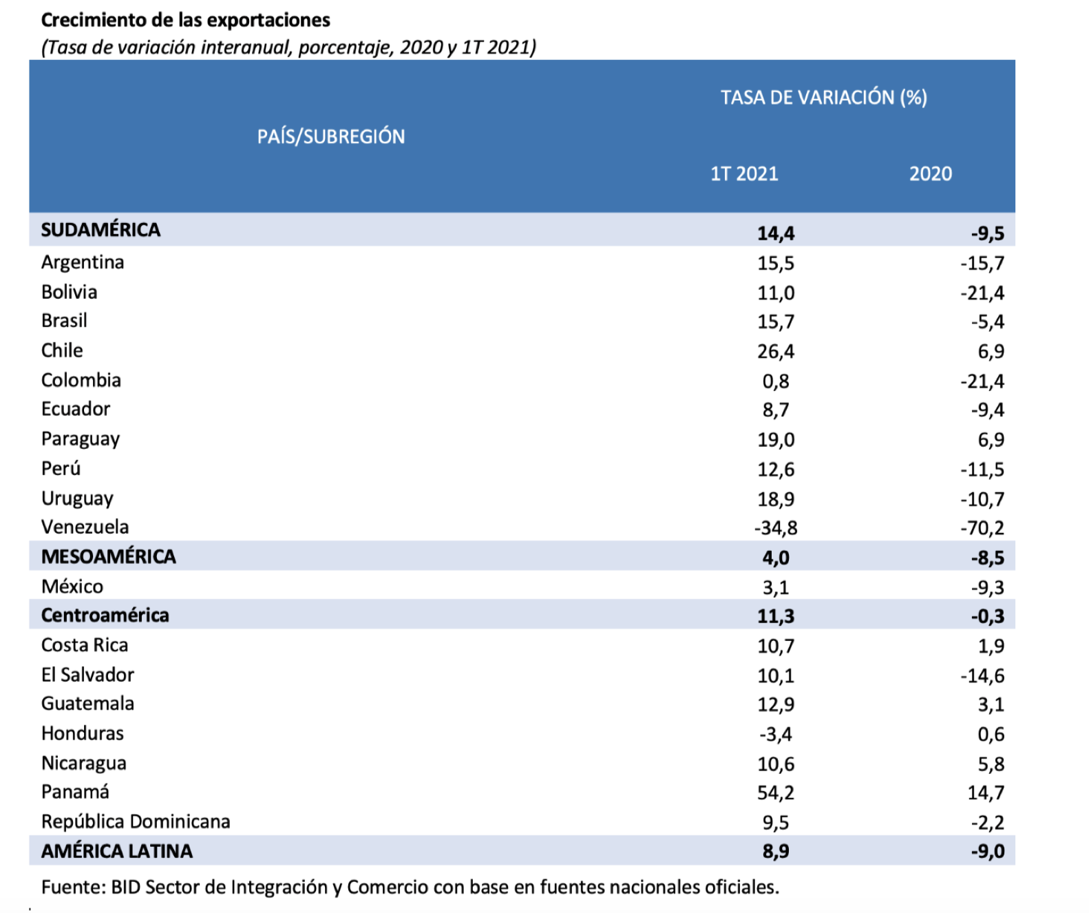 El valor de las exportaciones de América Latina creció 8,9% en el primer trimestre del 2021 frente al mismo período el año anterior, consolidando un cambio de tendencia tras la contracción ocasionada por la pandemia del COVID-19, según un informe del Banco Interamericano de Desarrollo (BID). La caída del valor de las ventas externas en 2020 fue del 9,0 %.