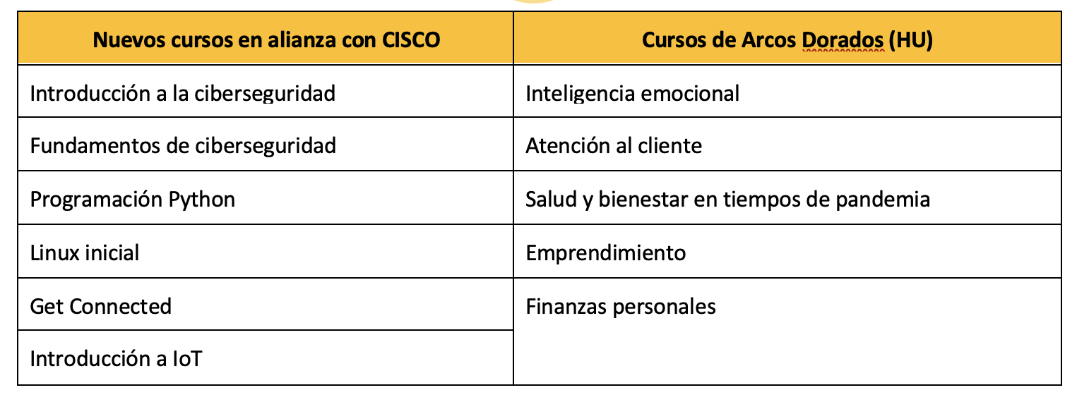 La nueva plataforma nace con una gran oferta de cursos para expandir el potencial de los jóvenes y así, sus oportunidades en el mercado laboral. Además de las opciones ya existentes en la iniciativa anterior, la compañía sumó nuevas temáticas relacionadas a lo digital y la tecnología de la información, a través de una alianza con CISCO, una de las empresas tecnológicas más importantes del mundo. En las próximas semanas, se agregarán más contenidos que responden a las principales necesidades de capacitación de los jóvenes hoy en día.