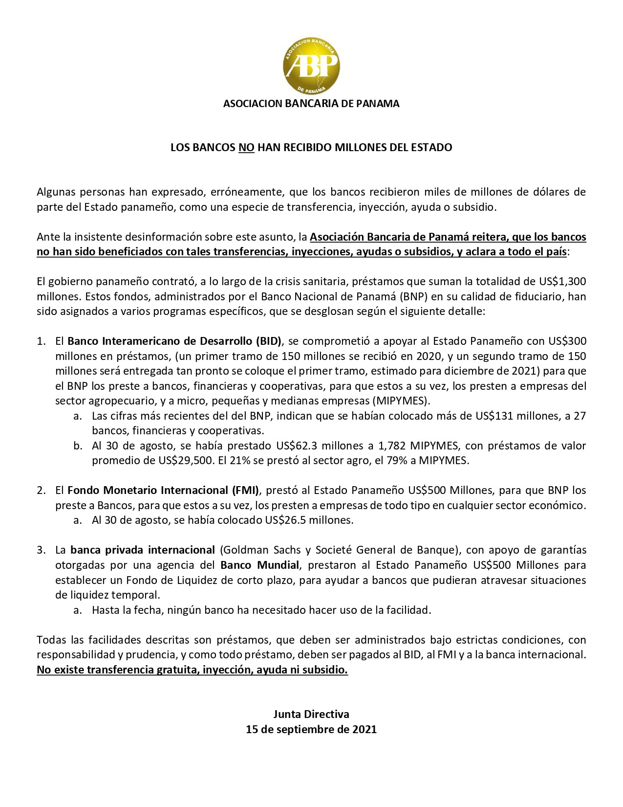 La Asociación Bancaria de Panamá aclara desinformación relacionada con supuestos subsidios o traspasos de miles de millones de dólares a los bancos. Agradecemos divulgación, para beneficio de la verdad y de la opinión pública.