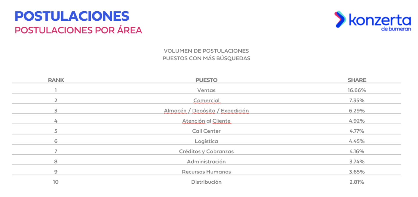 Dentro de los puestos con mayor participación en las postulaciones, se destacan Ventas con un 16,66%, seguido por Comercial con un 7,35% y Almacén / Depósito / Expedición con un 6,29%.