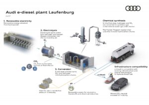 Desde hace ya algunos años, Audi lleva a cabo investigaciones sobre combustibles favorables al clima y basados en CO2, como e-gas, e-gasolina o el combustible sintéticamente producido e-diesel. La compañía ahora está dando el siguiente paso en la producción de e-diesel. «En el proyecto en Laufenburg, gracias a una nueva tecnología, podemos manejar la producción de e-diesel de manera eficiente en unidades compactas, lo que la hace más económica. La instalación experimental ofrece posibilidades de acoplamiento sectorial, es decir, combina los sectores energéticos de potencia, calor y movilidad y permite almacenar energía renovable», explicó Reiner Mangold, director de Desarrollo de Productos Sustentables de Audi AG.