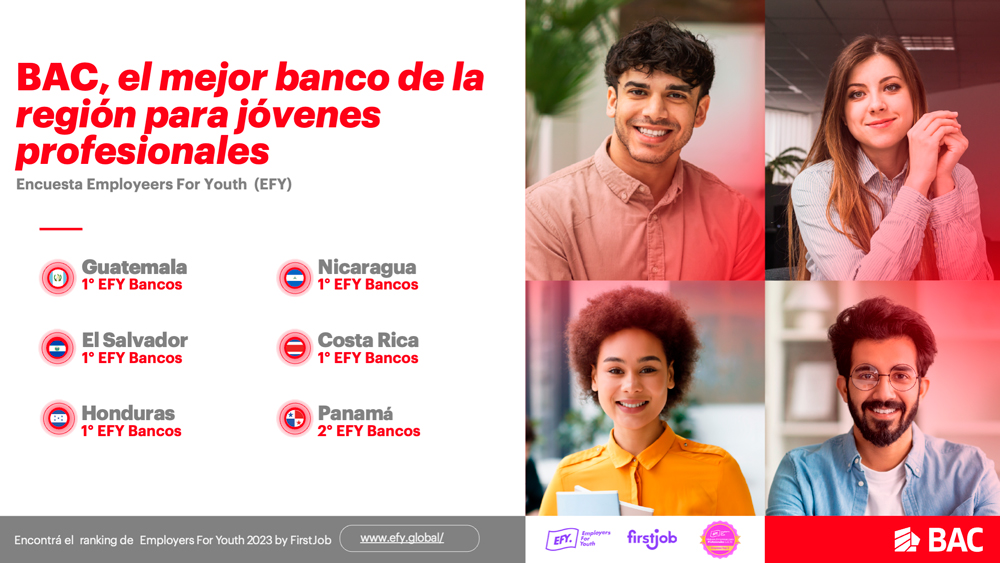 BAC es reconocida como la mejor empresa del sector financiero en la región para jóvenes profesionales, esto se desprende del estudio de percepción realizado por Employers for Youth (EFY) iniciativa de FirstJob.