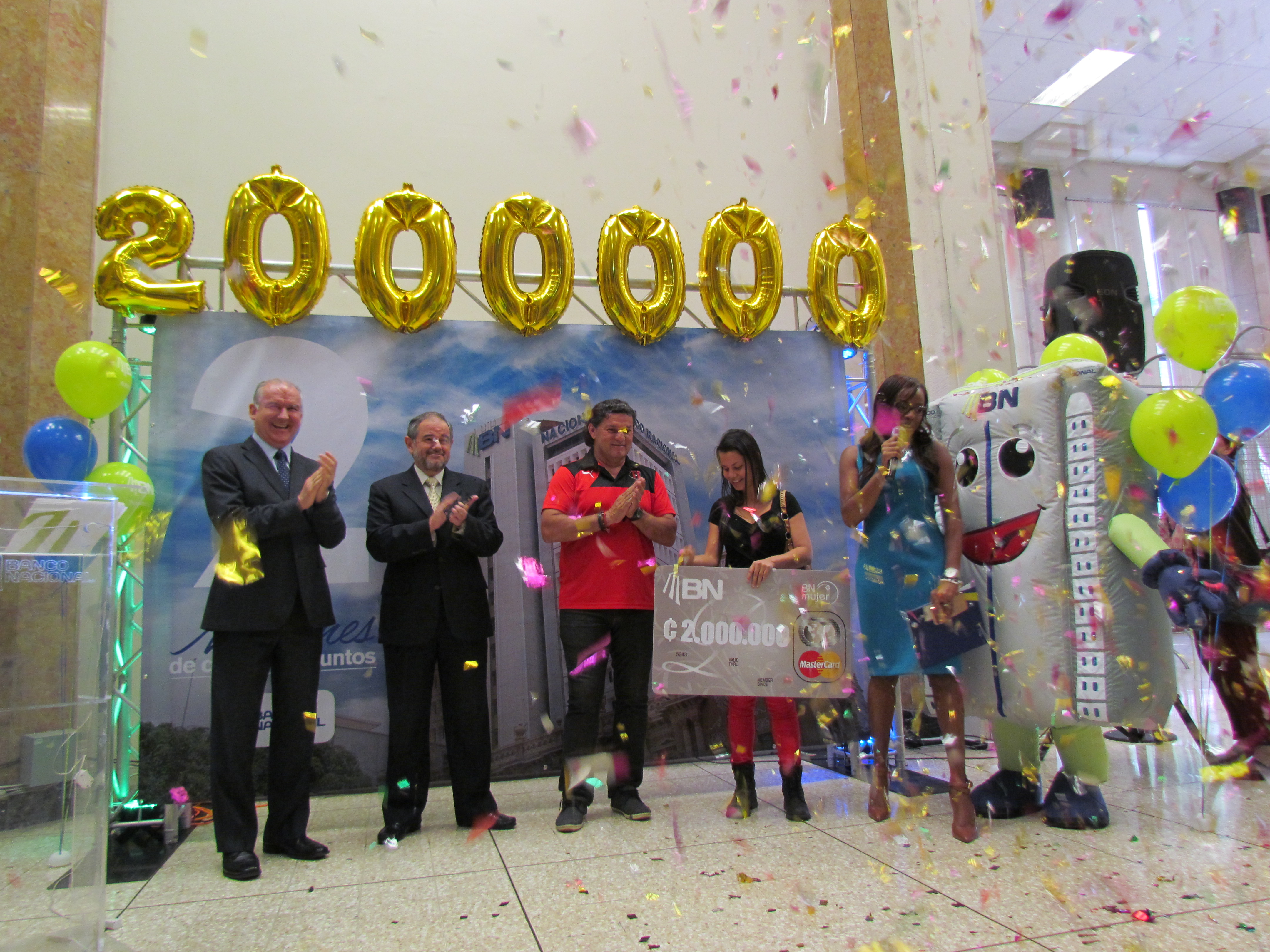 Juan Carlos Corrales, gerente general del Banco Nacional, Bernardo Alfaro, subgerente general de Riesgo y Crédito,  Mauricio “Chunce” Montero, invitado especial,  Naiomy Rojas Campos, cliente 2 millones y  Mishelle Mitchell, directora de Relaciones Institucionales del Banco Nacional.