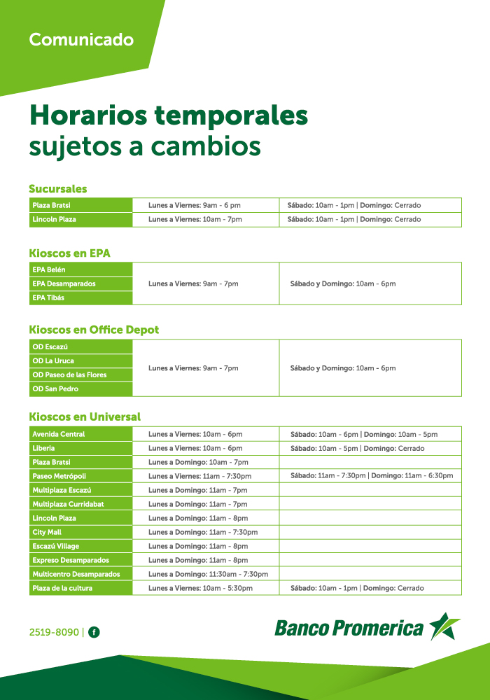 Para conocer sobre cambios en los puntos de atención, visite: @BancoPrormericaCostaRica