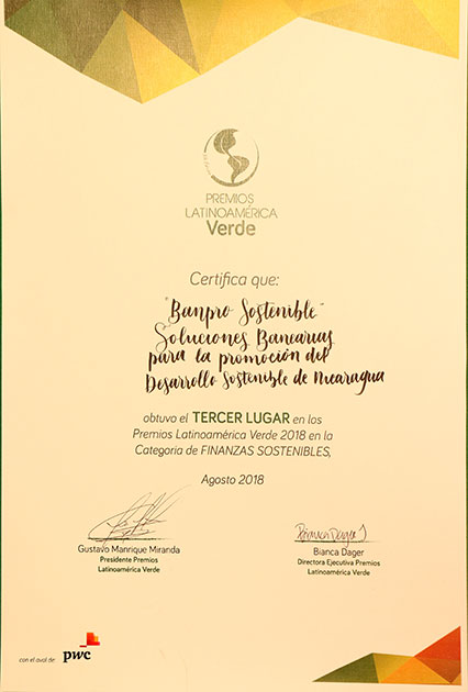 El proyecto “Banpro ProSostenible; Soluciones Bancarias para la promoción del Desarrollo Sostenible de Nicaragua” ocupó la tercera posición en la categoría Finanzas Sostenibles, tras ser evaluado por su impacto económico, social, ambiental, escalabilidad e innovación.  La postulación de “ProSostenible”, permitió mostrar a los diferentes grupos de interés, que la rentabilidad y la sostenibilidad, no son principios mutuamente excluyentes para el sector financiero y que la banca sostenible es un sector en crecimiento, con niveles de rentabilidad estables y una disminución de los riesgos para clientes e inversionistas.