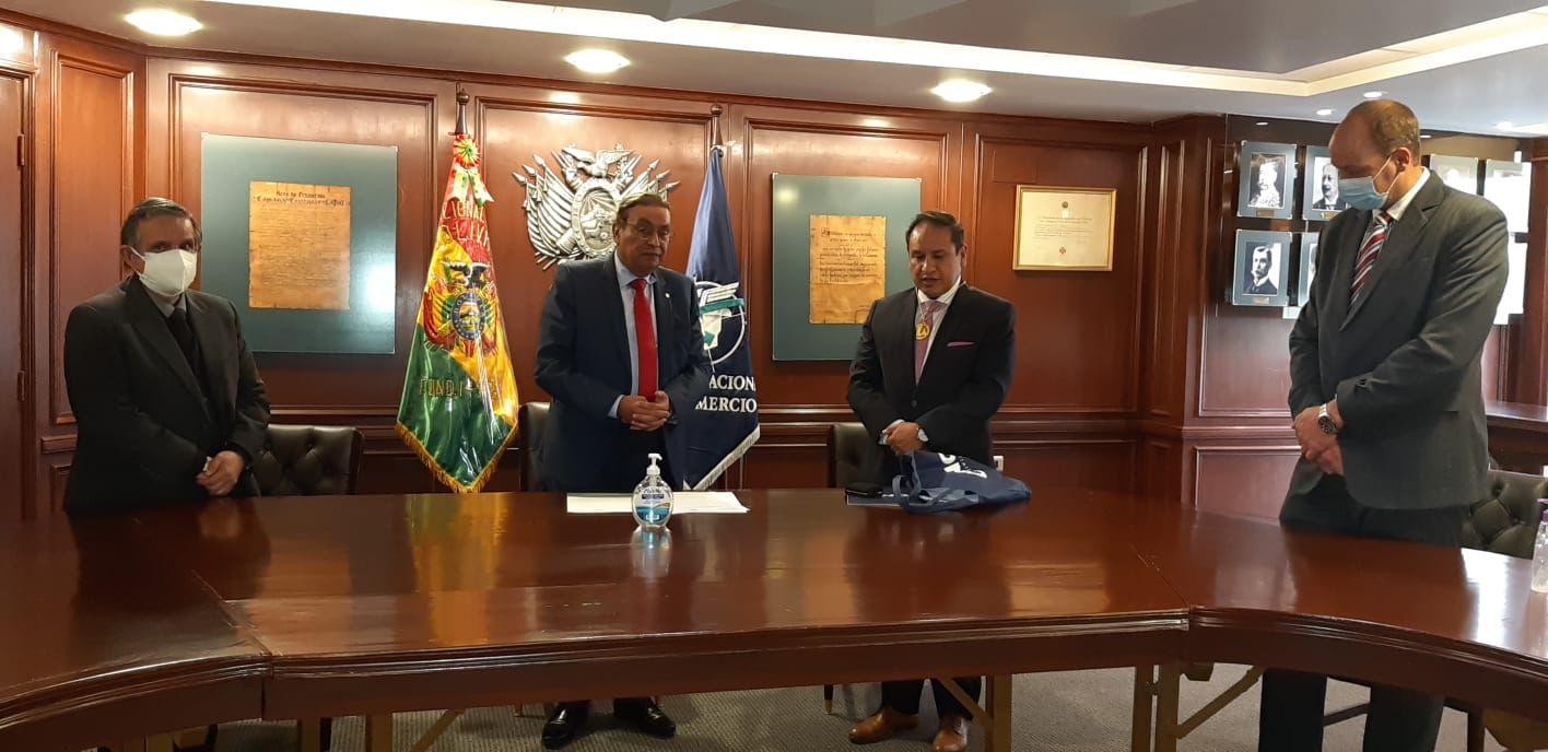 Doctor Rolando Kempff Bacigalupo, Presidente y miembros de la Directiva de la Cámara Nacional de Comercio de Bolivia y el banquero Nelson Hinojosa.