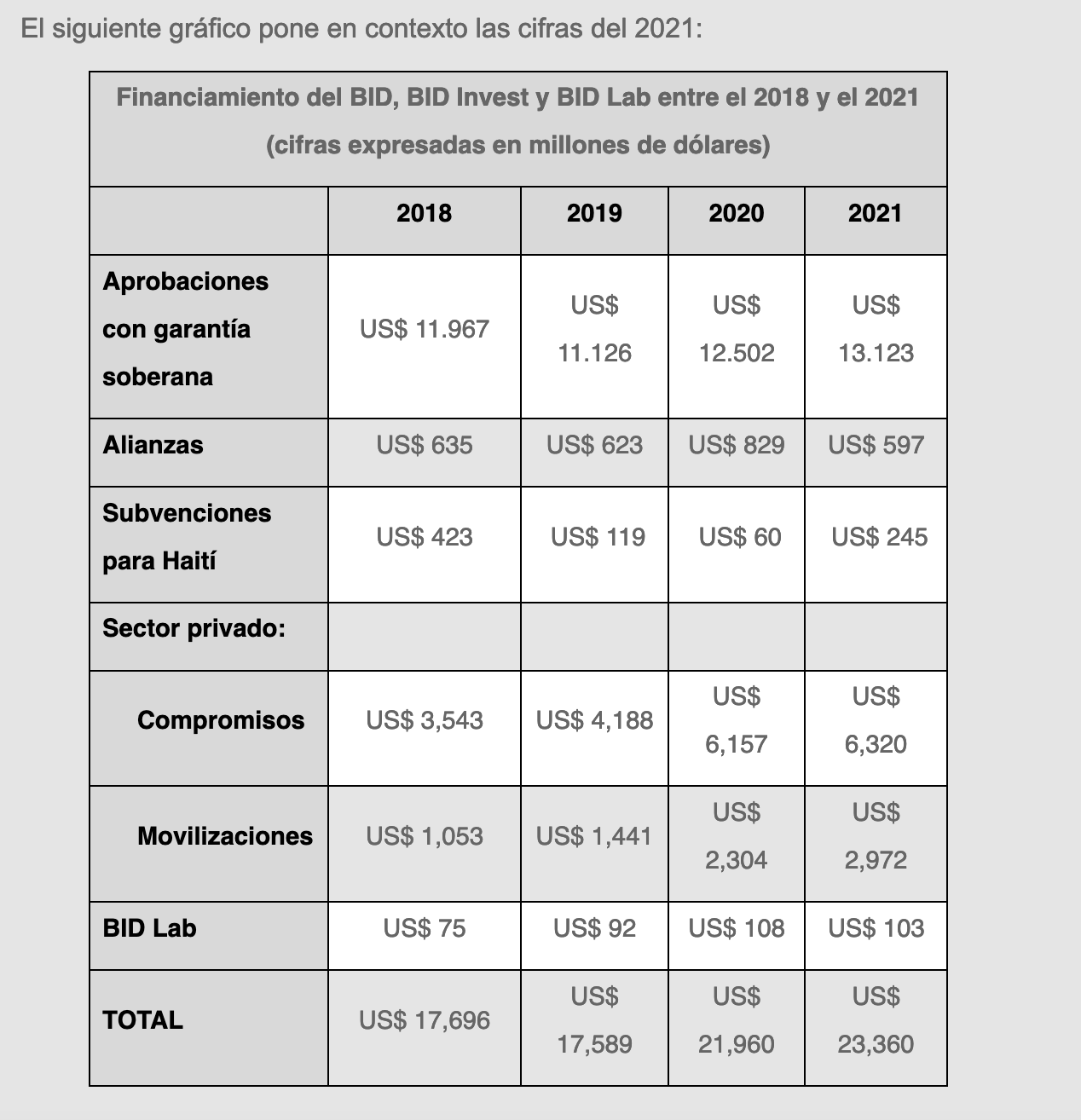 El BID y BID Invest informaron en diciembre que esperaban que las aprobaciones y los compromisos combinados para el 2021 sumaran casi US$20.000 millones, y US$22.300 millones si se incluían las cifras de movilización de BID Invest.