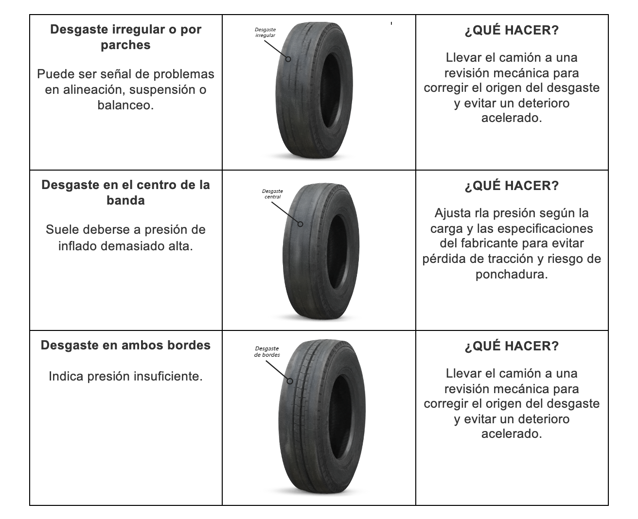 El desgaste de una llanta no es solo el reflejo del uso de esta, también es un indicador clave del estado del camión o de la unidad de bus, la presión de inflado y/o posibles fallas mecánicas.