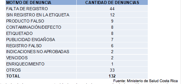 Según el motivo de las denuncias recibidas el pasado mes en el Ministerio de Salud, 44 por falta de registro, 12 sin registro en la etiqueta, 9 por productos falso y 8 por  contaminación/defecto.