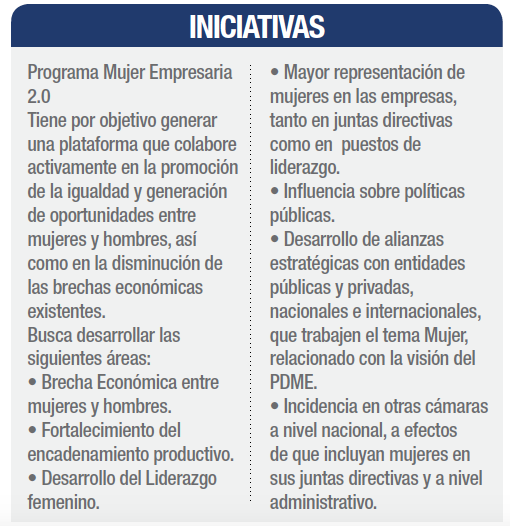La iniciativa estrella ha sido el de Programa Mujer Empresaria (PME), que nació en 2010 con la misión de crear espacios para que las mujeres empresarias cuenten con oportunidades que ayuden a disminuir las brechas económicas existentes y fomenta, además, la participación de las mujeres a lo interno de la Cámara.