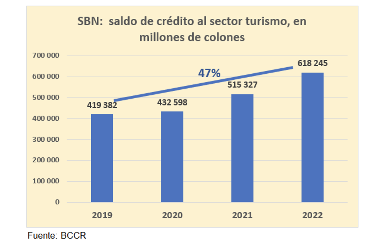 El sector de turismo, en el 2022, ha continuado su proceso de recuperación después de la crisis originada en la pandemia del COVID-19.  En el peor momento de la crisis, cuando el turismo estaba prácticamente paralizado, los bancos apoyaron al sector mediante restructuraciones de los créditos y después de la crisis el apoyo se ha manifestado en el incremento del crédito al sector.  En junio de 2022 el saldo de crédito del Sistema Bancario Nacional (SBN) al sector turismo alcanzó la cifra de 618 245 millones de colones, un 47% más que en junio del 2019.