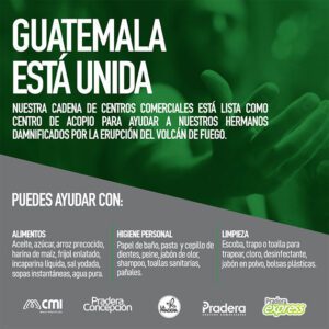 El Centro Comercial La Pradera Zona 10 se une para llevar ayuda a los damnificados por la tragedia suscitada en el Volcán de Fuego.  Y hace un llamado a todos sus visitante y población guatemalteca para que se unan y juntos apoyen a los damnificados.