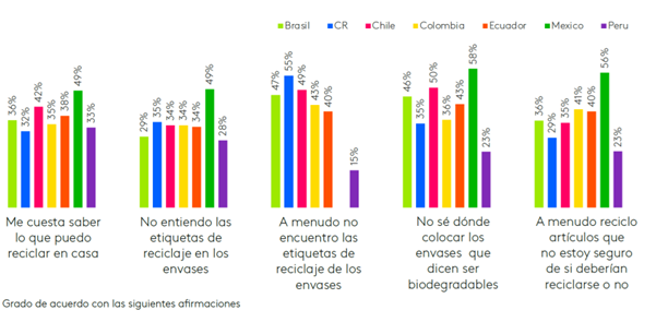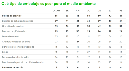 Los residuos plásticos son una preocupación con el medio ambiente cada vez mayor para la región, principalmente para Costa Rica – donde el tema es mencionado por el 10% de la población –, Chile, Colombia y Perú, alcanza el 9%. Es sabido que es el peor embalaje y Kantar ha revelado que el 55% de los consumidores de Latinoamérica ha nombrado a las bolsas de plástico siendo las campeonas entre los malos ejemplos. Los paquetes de cartón son los menos problemáticos (5%).