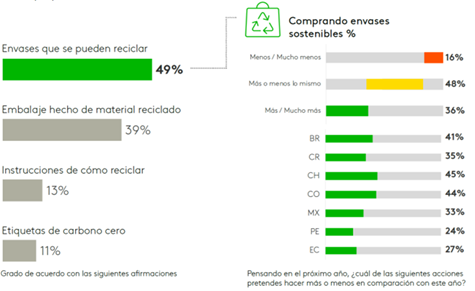 Se puede notar que la información que se busca de forma regular a la hora de comprar es bastante direccionada por la sostenibilidad en Latam. Sin embargo, el embalaje que se adapte al Carbono Cero todavía no es una elección para la población de esta región que adquiere alimentos empacados.