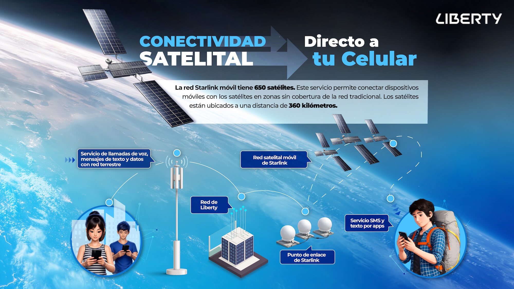 Este servicio se basa en una constelación de 650 satélites lanzados en órbita baja terrestre (LEO) que funcionan como torres de telefonía móvil en el espacio. Estos satélites se conectan directamente a la frecuencia propia de Liberty de 1.800 MHz, lo que permite la conectividad en teléfonos equipados con tecnología 4G LTE.