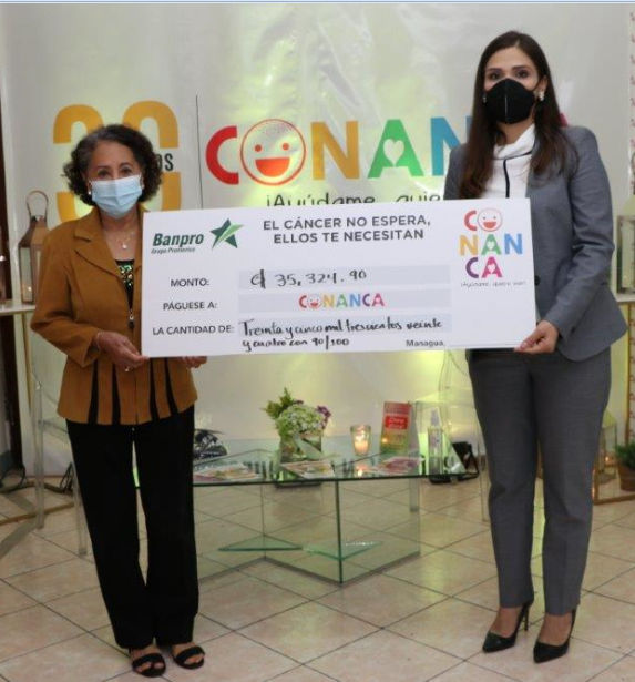 En nombre de Banpro Grupo Promerica, Brissey Quiñonez, gerente de la sucursal bancaria del Centro Corporativo entregó a la Comisión Nicaragüense de Ayuda al Niño con Cáncer (CONANCA) un donativo por la suma de C$ 35,324.90 córdobas, para que continúe con su loable labor de ayudar a los niños a superar la enfermedad. Asimismo, la entidad sin fines de lucro otorgó a Banpro un reconocimiento por su constante apoyo a esta noble causa.
