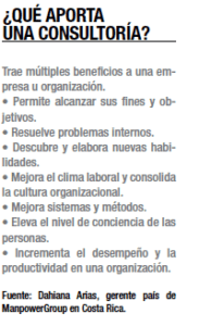 De forma similar opina Dahiana Arias, de ManpowerGroup, quien considera que una de las disciplinas más comunes es la legal, donde se agrupan las firmas de abogados. Además, el área de tecnologías de la información ha venido creciendo en los últimos años. “También podemos encontrar las soluciones de recursos humanos, y las comunicaciones también tienen su espacio dentro de las disciplinas donde más se realizan consultorías”, asegura.