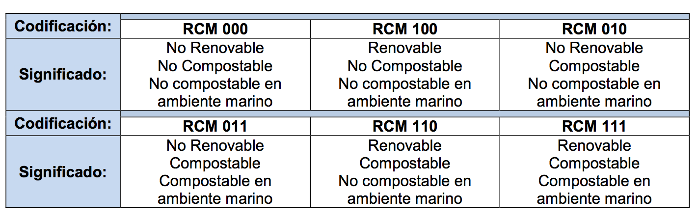 Por ejemplo, si el producto es proveniente de fuentes renovables pero no se puede compostar ni en tierra ni en ambiente marino, marcará en la etiqueta el código 1-0-0. Si cumple las tres condiciones (renovable y compostable en tierra y en ambiente marino) indicará el código 1-1-1 y así sucesivamente, como se detalla a continuación: