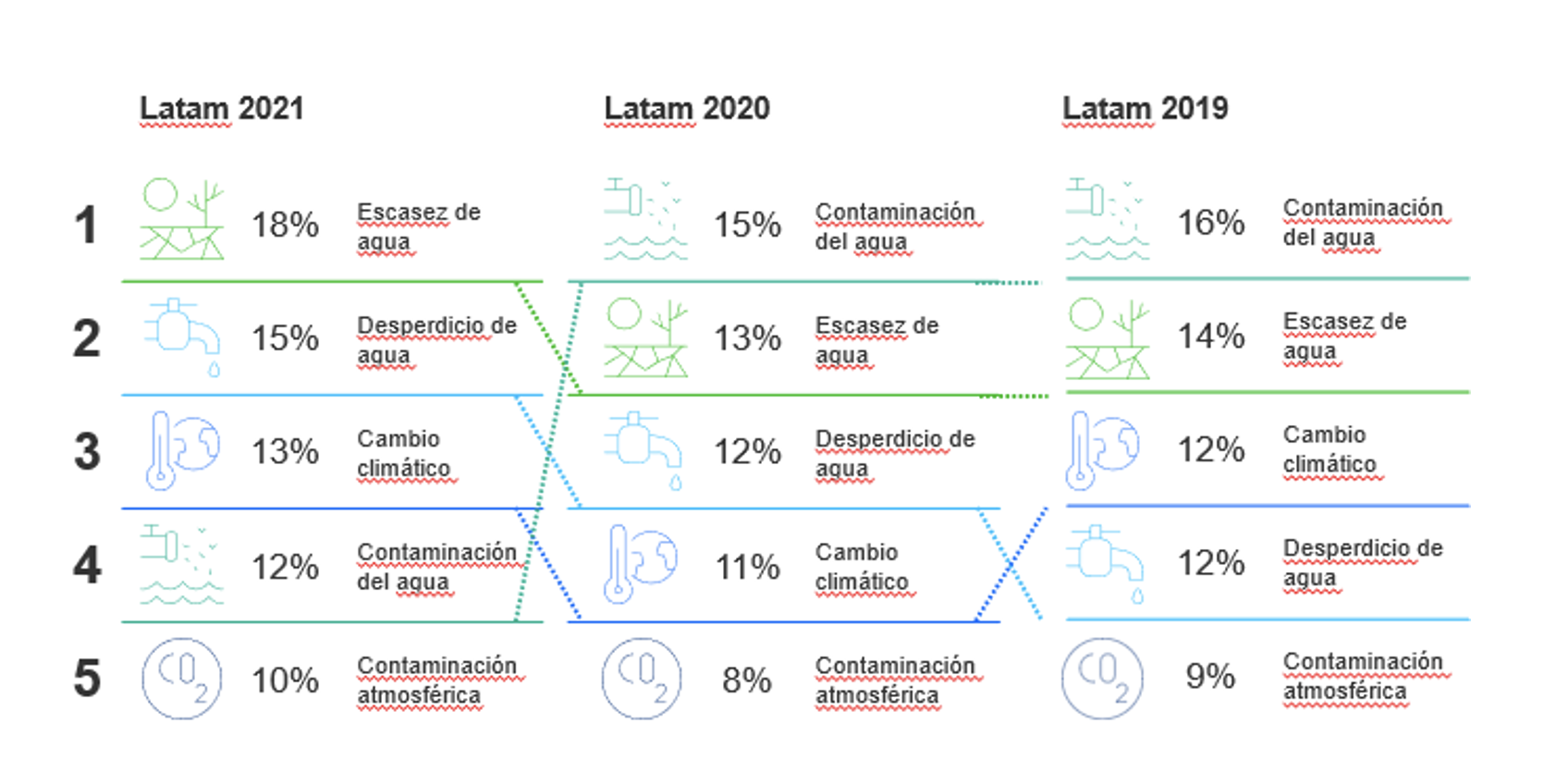 Las cifras de Latam están dominadas por preocupaciones sobre la calidad del agua y la gestión de ésta. La escasez de este líquido vital encabezó la encuesta en 2021, el desperdicio y la contaminación también se ubicaron entre los cinco primeros lugares; sin embargo vemos una y otra vez que en la región, existen enormes variaciones.