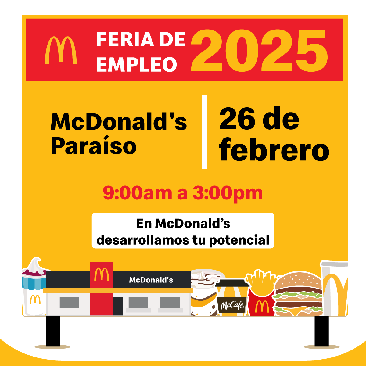 Arcos Dorados, franquicia que opera la marca McDonald’s en América Latina y el Caribe, realizará una feria de empleo en su restaurante ubicado carretera a Paraíso de Cartago, e invita a todas las personas interesadas a acercarse y postularse para  los puestos vacantes.