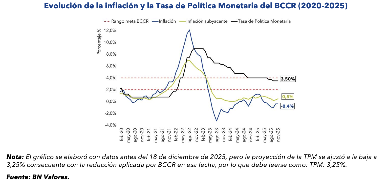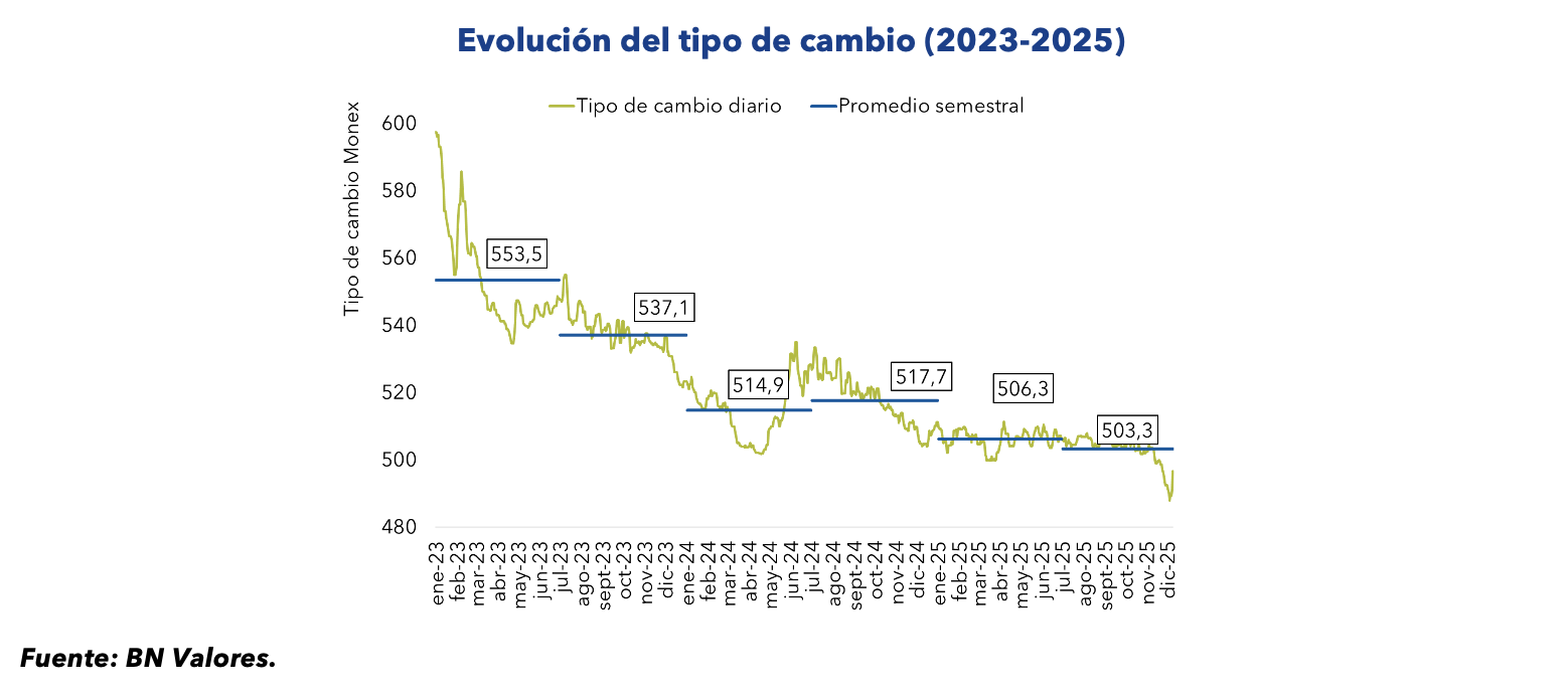 Para 2026, la Dirección de Tesorería del Banco Nacional (BN) estima una inflación del 1,83%, un tipo de cambio en torno a los ¢515 —con una variación aproximada del 0,58%—, una Tasa de Política Monetaria ubicada en 3,25% y un crecimiento económico proyectado del 3,79%.