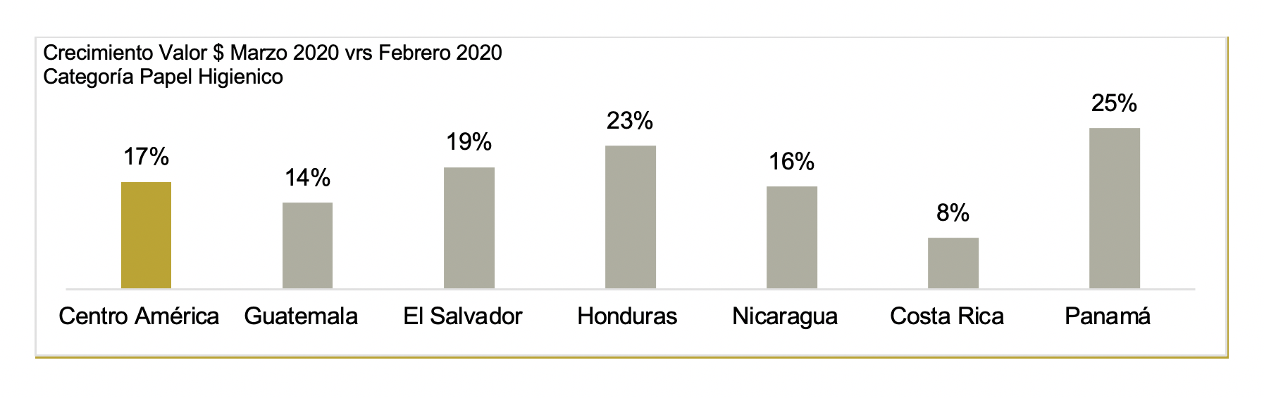 El desarrollo en ventas de esta categoría fue de doble dígito, creciendo en el mes de marzo un 17%, siendo que en enero y febrero de 2020 se contraía en promedio -3%. El punto de crecimiento fue la semana del 16 al 22 de marzo del 2020, donde la compra de papel higiénico creció un 21%, justo en la semana que muchos países iniciaron sus confinamientos.
