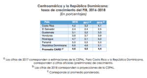 Para 2018 la Comisión Económica para América Latina y el Caribe (Cepal) estima que el crecimiento promedio de las economías de Centroamérica y República Dominicana (CARD) sería de un 4,4%. 0,4 puntos porcentuales por encima del anotado en 2017. Sin embargo, se espera una desaceleración del consumo y la inversión, ante nuevos incrementos de las tasas de interés y el nivel de precios, que será compensada por un mayor dinamismo de las exportaciones de bienes y servicios, y de las remesas.