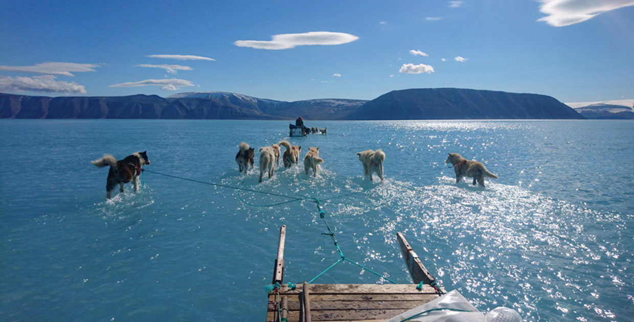 Ante su sorpresa por el cambio tan abrupto que había experimentado esta zona, Olsen hizo una foto del momento en el que los perros tiraban de su trineo con la patas sumergidas en el agua.