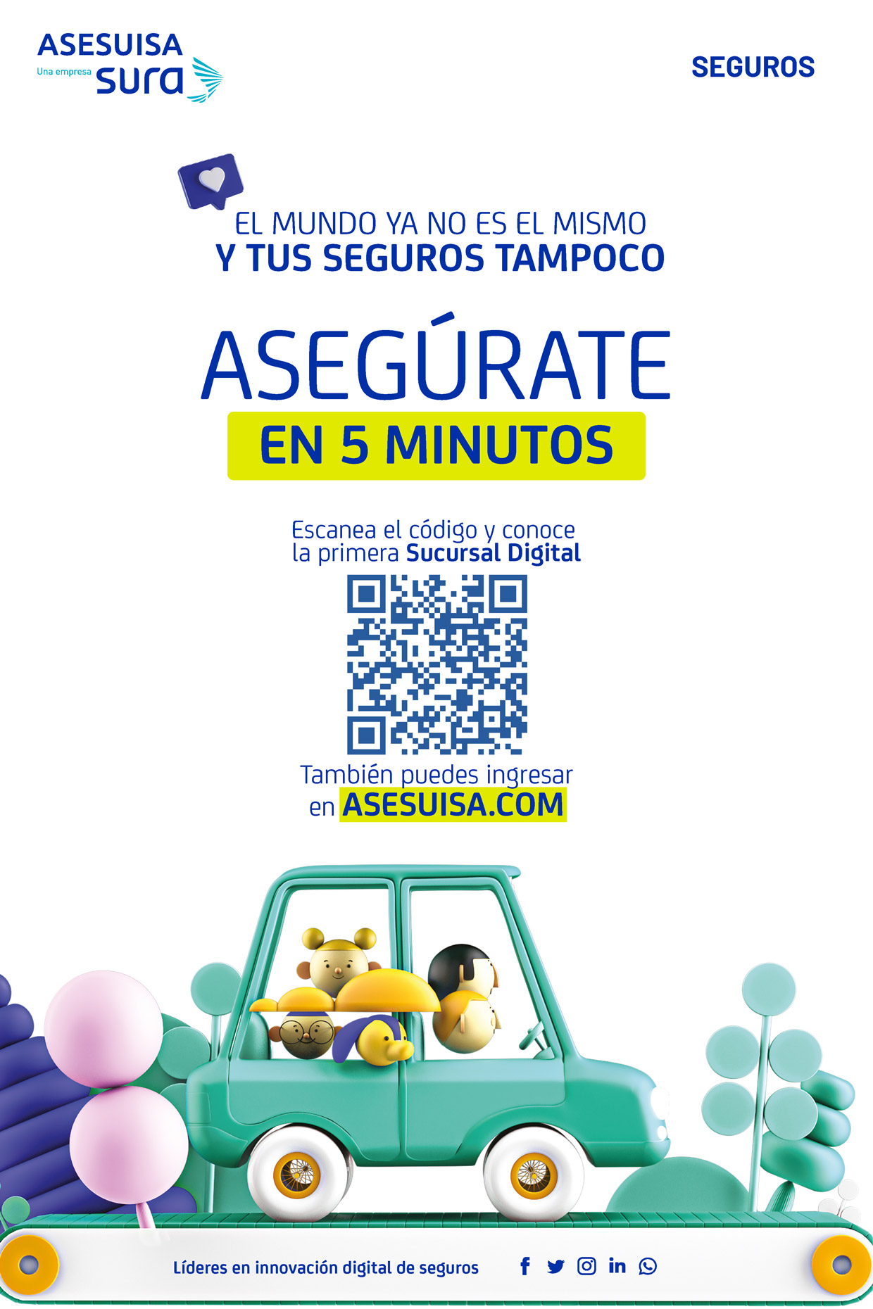 Asesuisa, una empresa Sura, líder en innovación digital de seguros, lanza la primera sucursal de seguros en el país, un nuevo acceso por medio del cual se podrán adquirir, en una primera etapa, seguros para autos y accidentes personales, completamente en línea. Esta nueva forma de adquirir un seguro ofrece facilidad y seguridad en la contratación, en no más de 5 minutos.