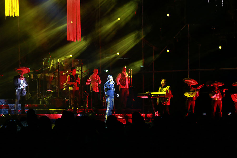 El show continúo con temas románticos como: “Hoy tengo ganas de ti”, “Me dedique a perderte”, “Abrázame”, “Se me va la voz”,  “Que voy hacer con mi amor”, entre otras. Después de una hora, los músicos hicieron una pausa, para darle lugar al mariachi, minutos más tardes salió el artista vistiendo su traje típico, para cantar sus mejores temas rancheros: “Mátalas”, “Cascos ligeros” “Sin tantita pena”, “Nueve viajera”, “Es la mujer”, entre muchos otros éxitos, que fueron coreados por los asistentes sin importar la inclemencia del tiempo, lo que Fernández glorificó…“Disculpen que no haya podido detener la lluvia, pero  no es obra mía, es de Dios, que nos está bendiciendo”.