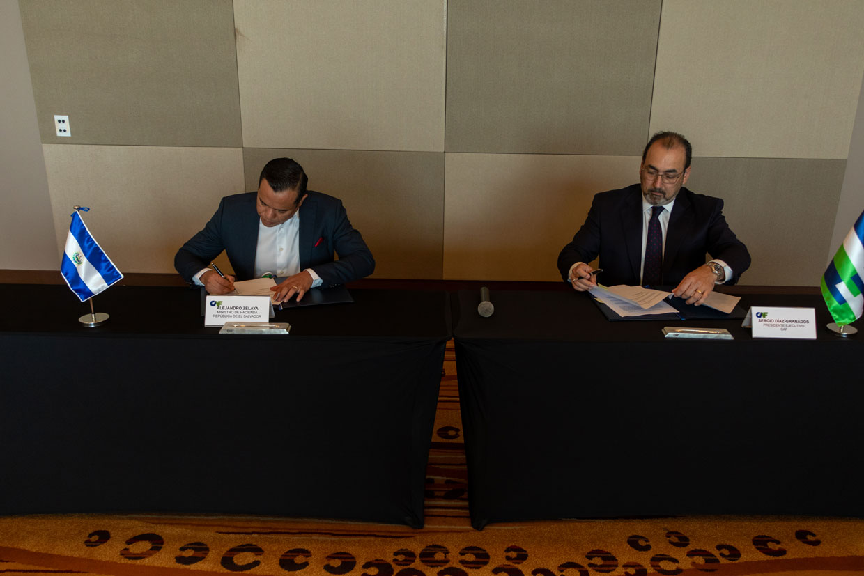 La República de El Salvador ratificó su intención de incorporarse como país miembro de CAF -banco de desarrollo de América Latina– mediante la firma de un convenio para tal fin y la suscripción de acciones nominativas de la Serie “B” correspondientes al capital ordinario de CAF, el cual fue firmado por el ministro de Hacienda, José Alejandro Zelaya, y el presidente ejecutivo de la institución, Sergio Díaz-Granados.
