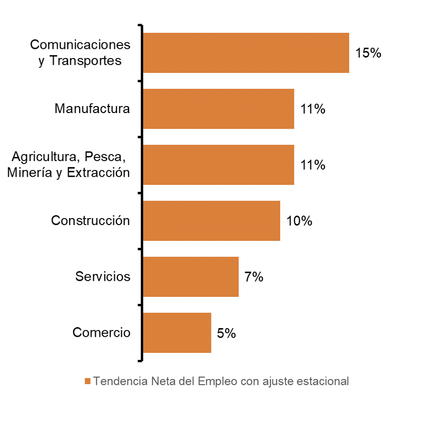 El mercado laboral más fuerte se reporta en el sector Comunicaciones y Transportes con una Tendencia de +15%, incrementando 7 puntos porcentuales en comparación con el trimestre anterior y 31 puntos porcentuales en comparación. Los sectores de Manufactura y Agricultura, Pesca, Minería y Extracción reportan una Tendencia Neta del Empleo de +11% cada uno, Construcción +10%, Servicios +7% y Comercio +5%.
