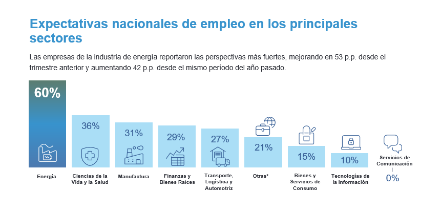 En todos los sectores se anticipan mayores expectativas de contratación para el primer trimestre de 2025. El sector más competitivo de Guatemala es energía, con una perspectiva de empleo de 60%, un aumento de 53 puntos porcentuales respecto al último trimestre, y con un aumento de 42 puntos porcentuales desde el mismo periodo del año pasado. Como resultado, se convierte en el sector con mayor incremento desde el último trimestre. Le siguen ciencias de la vida y la salud con 36% y manufactura con 31%.