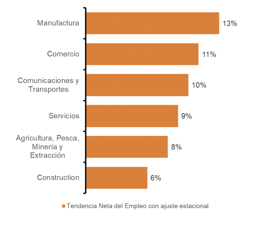 Empleadores en el sector Manufactura reportan las intenciones de contratación más optimistas, anticipando una Tendencia Neta del Empleo de +13%.