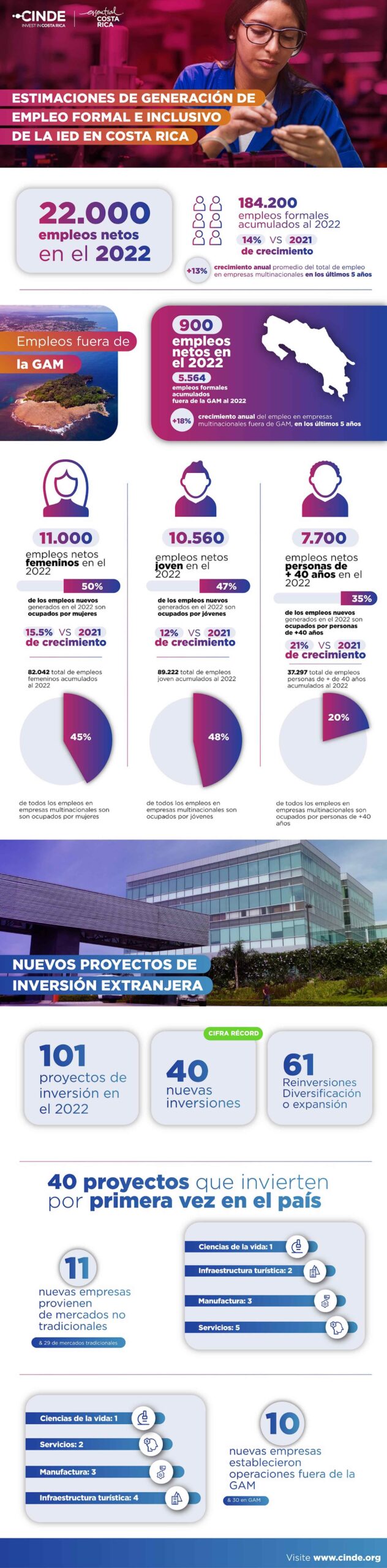 La Coalición Costarricense de Iniciativas de Desarrollo (CINDE) y el Ministerio de Comercio Exterior de Costa Rica (COMEX), anunciaron en conferencia de prensa que, durante el 2022, Costa Rica logró sumar 101 proyectos de inversión extranjera directa que generaron 22.000 empleos netos. Destacan 11 nuevas inversiones provenientes de siete geografías no tradicionales como Canadá, Chile y Alemania.