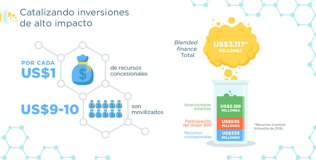 Al 31 de marzo de 2018, invertió US$333 millones de recursos concesionales de los donantes, a los que han sumado US$595 millones de nuestro propio capital para financiar 37 inversiones con soluciones de blended finance movilizando un total de US$3.117 millones. Cada dólar concesional invertido ha generado aproximadamente una inversión de US$2 de BID Invest y de casi US$10 de recursos movilizados.