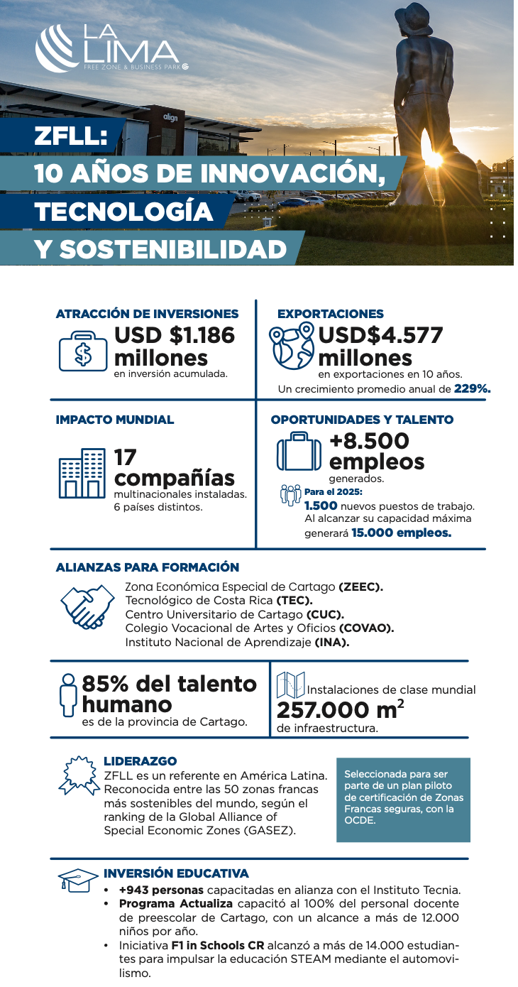 Con una proyección de más de 15.000 empleos directos en su máxima capacidad y una propuesta de valor basada en la excelencia operativa, el bienestar del talento y el impacto positivo, Zona Franca La Lima reafirma su compromiso de liderar el futuro industrial de Costa Rica, desde una mirada sostenible y con propósito.