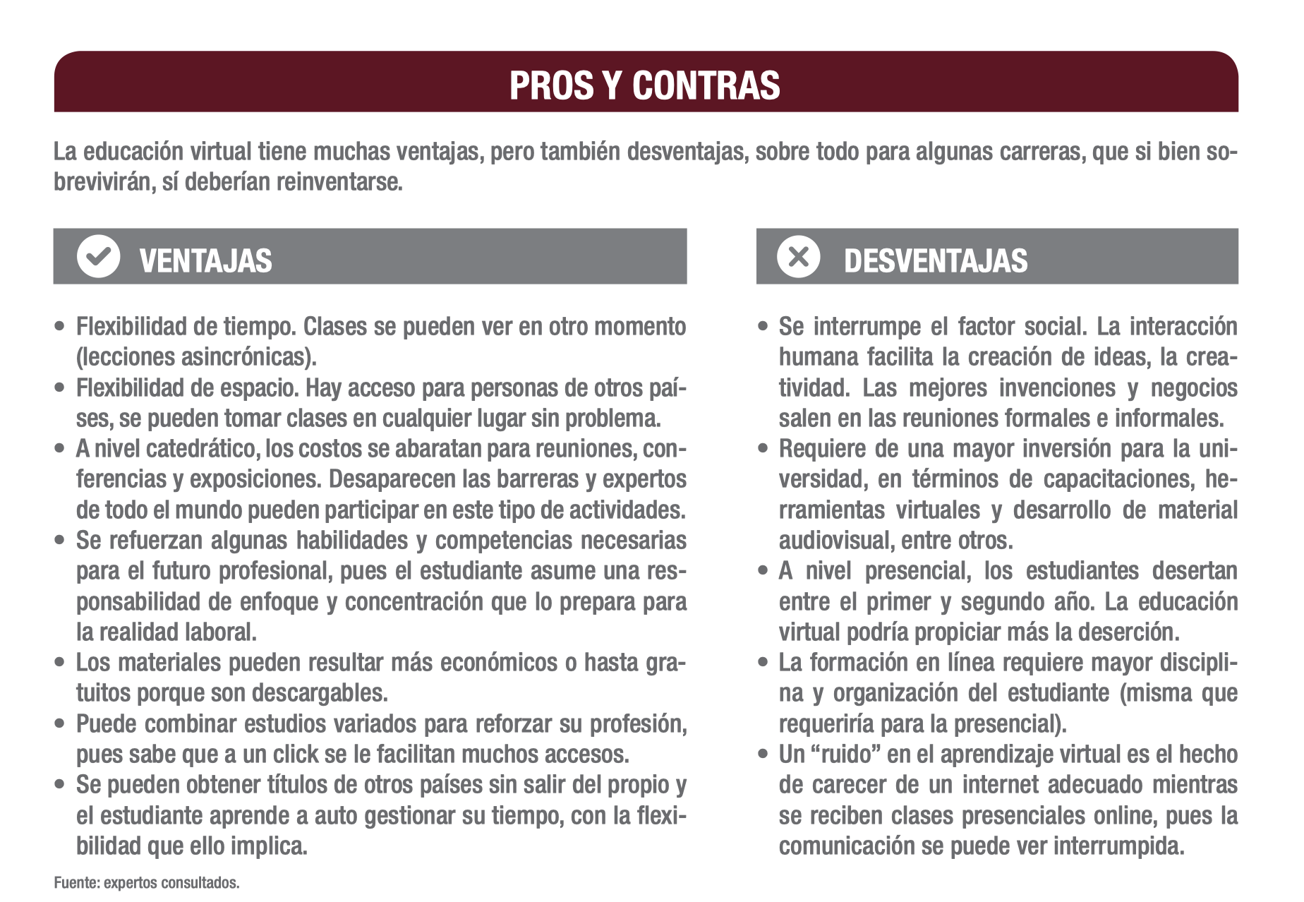 Así, el COVID-19 solo aceleró lo que ya caminaba con fuerza. Son más los impactos positivos de toda esta revolución en la enseñanza superior que los negativos, pero por ello la clave es la combinación de las dos modalidades para darle al estudiante lo mejor.