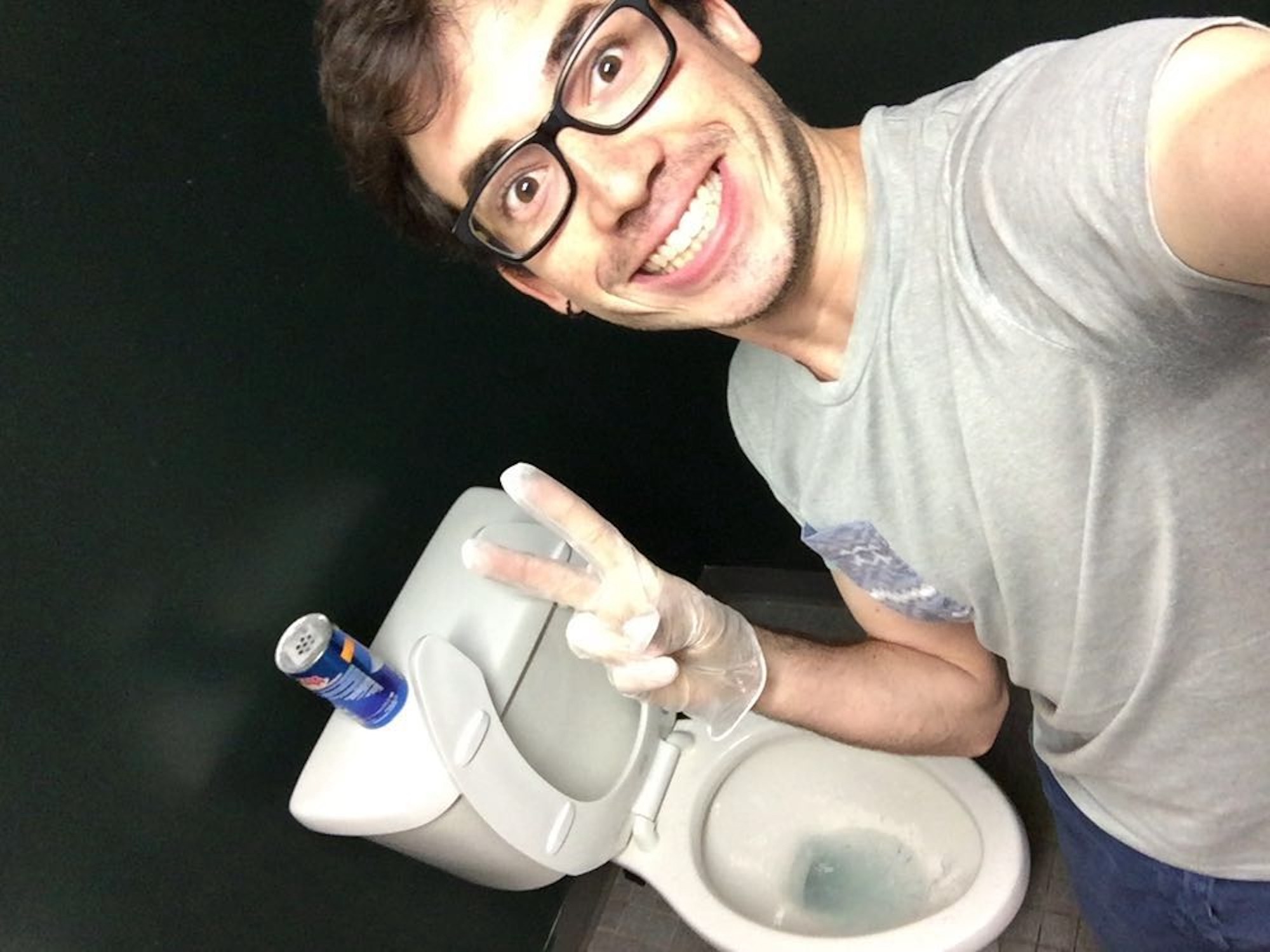 ¿Por qué la foto de Alejandro con el inodoro? Bueno, para hacer el cuento corto, estando en su “internship” un día nos llamó frustrado y nos dijo que iba a renunciar porque el tiempo que le permitían estar en los estudios era mínimo y que la mayor parte del día se la pasaba haciendo mandados para los ingenieros productores (que son famosos), comprando café, limpiando la cocina y a veces hasta los baños. Claro que el recién graduado estaba esperando que le permitieran tocar las consolas y grabar a los artistas famosos que llegaban. Luego de escucharlo pacientemente, le dimos algunos consejos, le dijimos que la decisión era suya, pero que creíamos que debía de tener paciencia porque era una oportunidad de oro poder aprender de los “pro”. Casi al final de la conversación le recordamos lo importante de recorrer la milla extra en todo lo que hiciera y cerré diciéndole: ¡Si te ponen a lavar inodoros entonces sé el mejor lavador de inodoros que haya pasado por Studio G! Como a los dos días nos llegó la foto.