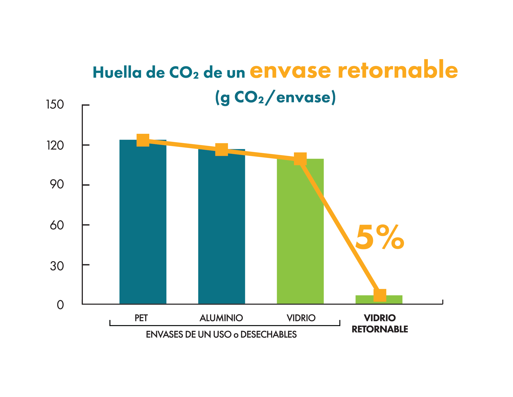 Con cada ciclo sucesivo de reutilización los envases de vidrio retornable disminuyen su huella de carbono. Si estos se reutilizan solamente 20 veces, se trata de una botella con una huella de carbono de tan solo el 5% respecto a cualquiera de las alternativas de envase desechables, ¡tan pequeña como 7g CO2/envase! Gracias a esta propiedad se puede afirmar que la botella de vidrio retornable es la opción de envase más amigable con el medio ambiente.
