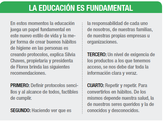 “Florex ya había diseñado y producía productos higiénicos y de desinfección antes del COVID-19, por ejemplo: sanitizantes de manos con base en alcohol, jabones de manos antibacteriales, desinfectantes para superficies y objetos a base de distintas materias primas muy eficientes y en distintas presentaciones. Son productos que cumplen rigurosamente con estándares establecidos por instituciones como la OMS y estándares de nivel internacional”, comenta Silvia Chaves, propietaria y presidenta de Florex.