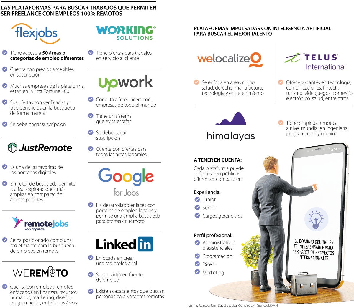 Algunas de las plataformas específicas que los ‘freelance’ pueden utilizar para conseguir trabajo son LinkedIn, RemoteJobs, Weremoto y FlexJobs, esta última “cuenta con una suscripción de bajo costo con acceso a las empresas más reconocidas del mercado laboral”, señaló Escobar.